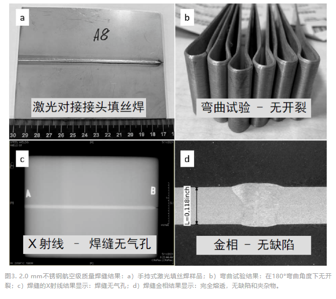 焊縫評估結(jié)果如下所示(圖3),包括根據(jù)AWS D17.1:2017(A類)- 航空航天級的熔焊規(guī)范進行目視和金相檢查、拉伸試驗和彎曲試驗。