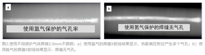 傳統(tǒng)的弧焊工藝使用氬氣作為不銹鋼和鋁的保護氣體,以防止焊接熔池氧化。激光焊接使用氮氣提供更好的焊接結(jié)果。使用氮氣和氬氣作為保護氣體的焊接結(jié)果如下所示(圖2)。