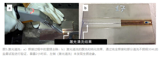 激光清洗最重要的優(yōu)勢之一是焊接后不銹鋼酸洗和鈍化。圖5b顯示了浸入35℃鹽霧溶液(Morton Culinox 999/DI Type IV)中2小時后的樣品。焊后對樣品左側(cè)進行激光清洗,右側(cè)保持焊接狀態(tài)。焊接樣品右側(cè)發(fā)現(xiàn)明顯的生銹跡象,但是在激光清洗后,左側(cè)未發(fā)現(xiàn)生銹。該示例證明了激光清洗可以取代不銹鋼應(yīng)用的傳統(tǒng)酸洗和鈍化過程。