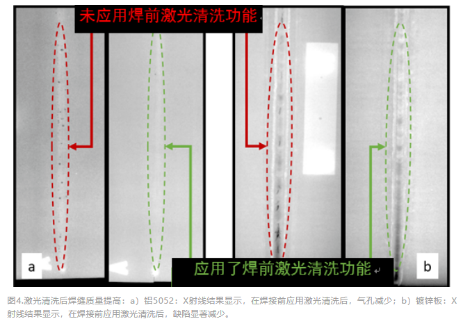 LightWELD XC手持激光焊接清洗一體機具有激光光斑尺寸小和高頻脈沖控制特征,可以針對焊接前后發(fā)生變色和污染的表面提供清洗功能。由于氧化層和污染物會對氣孔率和焊縫質(zhì)量產(chǎn)生顯著影響,該功能對于鋁等材料的焊接至關(guān)重要。在傳統(tǒng)工藝中,操作員在焊接前使用丙酮或其他化學(xué)物質(zhì)清洗接頭。激光可以燒蝕所有污染物并去除氧化層,例如,圖4顯示了激光清洗如何提高鋁5052和鍍鋅板的焊縫質(zhì)量。