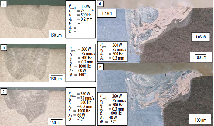 具有空間和時間功率調(diào)制(c)的焊縫,在不同材料組合中的焊縫傾斜補償(d,e)