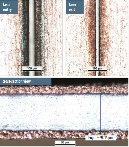 圖2用類星體UV80激光切割的厚覆銅LCP。入口(左上角)、出口(右上角)和橫截面(底部)視圖展示了通過時(shí)間定制的ns脈沖實(shí)現(xiàn)的干凈、高質(zhì)量的切割。