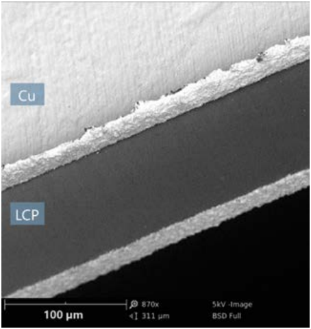 特別值得注意的是LCP切割邊緣的光滑度和垂直度,沒有明顯的“桶裝”或從銅鋪管機(jī)的切割邊緣拉回。高度放大的界面SEM視圖如圖4所示,并確認(rèn)LCP和Cu層之間的結(jié)合得到了很好的保留。更詳細(xì)的細(xì)節(jié)還顯示了光滑平坦的LCP表面,沒有任何從切割銅邊緣拉回的痕跡。