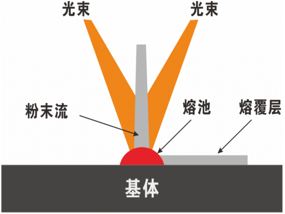 中心送粉技術(shù)簡稱光包粉技術(shù),即熔覆頭中心設(shè)有單束粉末通道,激光束圍繞金屬粉呈周圍環(huán)狀分布或者多束周向環(huán)繞分布。實際工作中,金屬粉自中心通道在重力及氣動的作用下輸出,外圍激光與金屬粉在基體上方相交于一處,處于中心位置的金屬粉被激光光束環(huán)繞充分吸收光能量成為熔融或者半熔融狀態(tài),之后熔融狀態(tài)的金屬粉落入基體表面的熔池,在基體表面形成平整致密的冶金熔覆層。