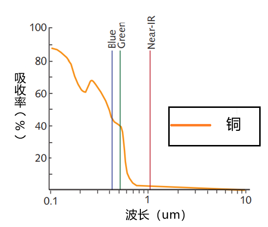 圖2金屬銅對(duì)不同三種波長(zhǎng)的激光吸收率的對(duì)比