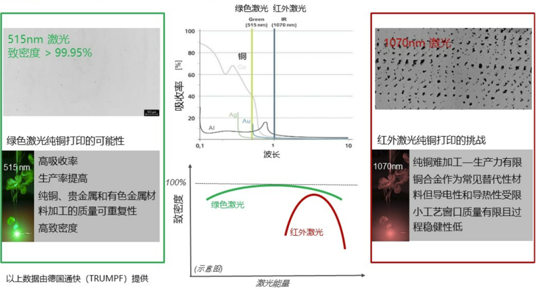 金屬材料3D打印的激光光源,目前主要使用1um 近紅外單模光纖激光器。1um 近紅外單模光纖激光器由于銅材料的吸收系數(shù)上,存在吸收系數(shù)較低,并且隨溫度影響較大的缺點(diǎn),導(dǎo)致打印樣品致密度較低,而且過(guò)程穩(wěn)健性差。綠色激光,作為高反金屬材料3D打印的最佳光源,進(jìn)行純銅材料3D 打印,可以良好的解決相關(guān)問題,實(shí)現(xiàn)大于99.95%的致密度。