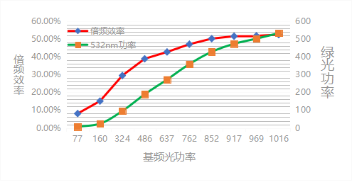 圖8 500W 連續(xù)綠光-倍頻功率和效率曲線