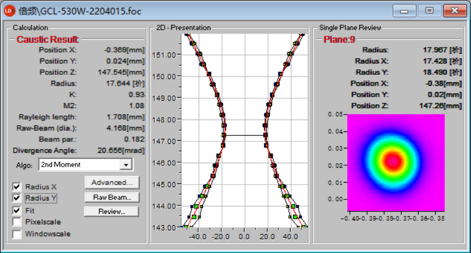 圖10 530W功率輸出,GCL-500光束質(zhì)量M2測(cè)試結(jié)果