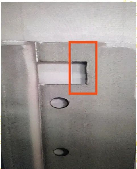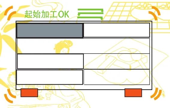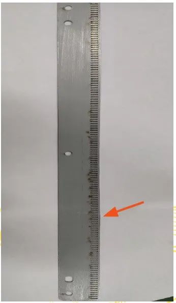 生產(chǎn)過(guò)程中,有時(shí)會(huì)使用TK機(jī)械手輔助取出切割完成的制品,這樣能更好地節(jié)約人力物力,實(shí)現(xiàn)設(shè)備的全自動(dòng)化生產(chǎn)。但是在使用TK機(jī)械手取出制品時(shí)需要注意,要控制好制品的取出順序,避免板材因強(qiáng)度減弱、材料晃動(dòng)產(chǎn)生切割波紋。如果先選擇將板材兩端制品取出,再將板材中間的制品取出,這樣就會(huì)造成板材兩端的應(yīng)力被釋放,板材強(qiáng)度不足,當(dāng)加工程序進(jìn)行到板材中間位置時(shí),板材勢(shì)必會(huì)因強(qiáng)度不足而產(chǎn)生晃動(dòng),造成制品的切割波紋,如圖9所示,且產(chǎn)品不良率較高,加工損失較大。如果從遠(yuǎn)離夾鉗一側(cè)將制品依次取出,這樣可以很好地保證加工位置板材應(yīng)力集中,運(yùn)動(dòng)穩(wěn)定,避免產(chǎn)生切割波紋,如圖10所示。因此在加工編程時(shí),要保證被取出的制品從遠(yuǎn)離夾鉗一端依次進(jìn)行,這樣可以很好地保證板材強(qiáng)度,避免板材在運(yùn)動(dòng)過(guò)程中因強(qiáng)度不足而產(chǎn)生晃動(dòng),從而避免切割波紋的產(chǎn)生。