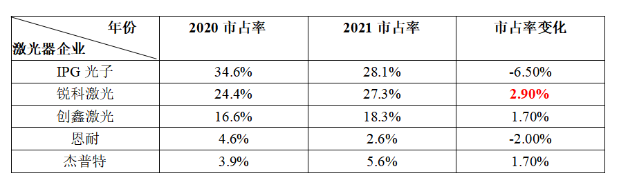 低價(jià)內(nèi)卷就一定能贏得市場(chǎng)嗎?銳科激光始終走穩(wěn)扎穩(wěn)打的技術(shù)路線,堅(jiān)持做品質(zhì)產(chǎn)品,拒絕內(nèi)卷,反而贏得了市場(chǎng)的認(rèn)可。根據(jù)中國(guó)激光產(chǎn)業(yè)發(fā)展報(bào)告,銳科激光的國(guó)內(nèi)市場(chǎng)銷售份額從2020年的24.4%增長(zhǎng)至2021年的27.3%,占據(jù)國(guó)產(chǎn)光纖激光器國(guó)內(nèi)市場(chǎng)占有率第一的位置,幾乎追平國(guó)外頭部激光器企業(yè)在中國(guó)的市場(chǎng)份額(相差不足1%)。從市占率變化來看,銳科在眾多激光企業(yè)中提升最快,這一定程度地通過市場(chǎng)認(rèn)證了銳科拒絕內(nèi)卷,堅(jiān)持走高端制造戰(zhàn)略路線的正確性。