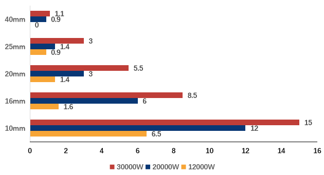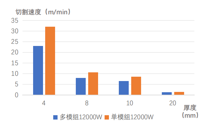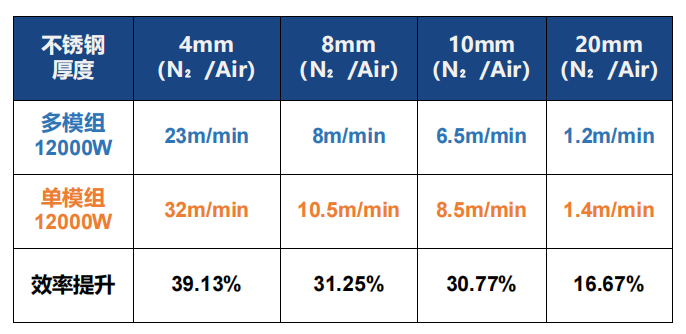 單模組萬瓦激光器的優(yōu)勢在中薄板切割速度,以銳科單模組12000和多模組12000激光器進(jìn)行對比,在20mm以下不同厚度的不銹鋼輔助氮?dú)饣蚩諝馇懈顥l件下,單模組12000切割效率優(yōu)于多模組12000光纖激光器。