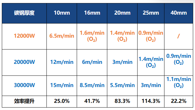 多模組30kW、多模組20kW及多模組12kW切割碳鋼進(jìn)行工藝實(shí)測(表格中未標(biāo)注輔助氣體的為空氣)