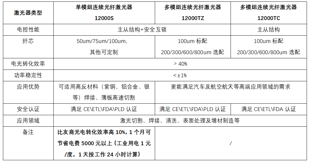 此外,為了滿足不同公司個(gè)性化應(yīng)用需求,同種功率下銳科可提供更多選擇。以12kW為例,銳科生產(chǎn)制造單模組連續(xù)光纖激光器12000S、多模組連續(xù)光纖激光器12000TZ、12000TC等多種同功率的光纖激光器,而且同一類型的激光器還可定制匹配不同的纖芯,可最大程度地滿足客戶的需求。
