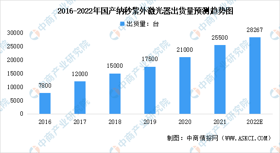 從具體的市場(chǎng)容量上看,國(guó)產(chǎn)納秒紫外激光器出貨量由2016年的7800臺(tái)增長(zhǎng)至2020年的21000臺(tái),復(fù)合年均增長(zhǎng)率為27.9%。中商產(chǎn)業(yè)研究院預(yù)測(cè),2022年我國(guó)國(guó)產(chǎn)納秒紫外激光器出貨量將達(dá)28267臺(tái)。