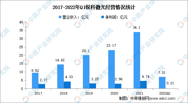 銳科激光是一家專業(yè)從事光纖激光器及其關(guān)鍵器件與材料的研發(fā)、生產(chǎn)和銷售的國(guó)家火炬計(jì)劃重點(diǎn)高新技術(shù)企業(yè),擁有高功率光纖激光器國(guó)家重點(diǎn)領(lǐng)域創(chuàng)新團(tuán)隊(duì)和光纖激光器技術(shù)國(guó)家地方聯(lián)合工程研究中心,是全球有影響力的具有從材料、器件到整機(jī)垂直集成能力的光纖激光器研發(fā)、生產(chǎn)和服務(wù)供應(yīng)商。主營(yíng)業(yè)務(wù)包括為激光制造裝備集成商提供各類光纖激光器產(chǎn)品和應(yīng)用解決方案,并為客戶提供技術(shù)研發(fā)服務(wù)和定制化產(chǎn)品。2021年銳科激光實(shí)現(xiàn)營(yíng)業(yè)收入34.1億元,凈利潤(rùn)達(dá)4.74億元,同比增長(zhǎng)60.17%。2022年第一季度實(shí)現(xiàn)營(yíng)業(yè)收入7.01億元,凈利潤(rùn)0.21億元。