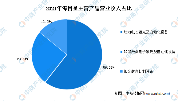 分產(chǎn)品來看,2021年海目星主營(yíng)動(dòng)力電池激光及自動(dòng)化設(shè)備、3C消費(fèi)類電子激光及自動(dòng)化設(shè)備、鈑金激光切割設(shè)備,其營(yíng)業(yè)收入分別占主營(yíng)業(yè)務(wù)收入的56.05%、23.54%、12.95%。