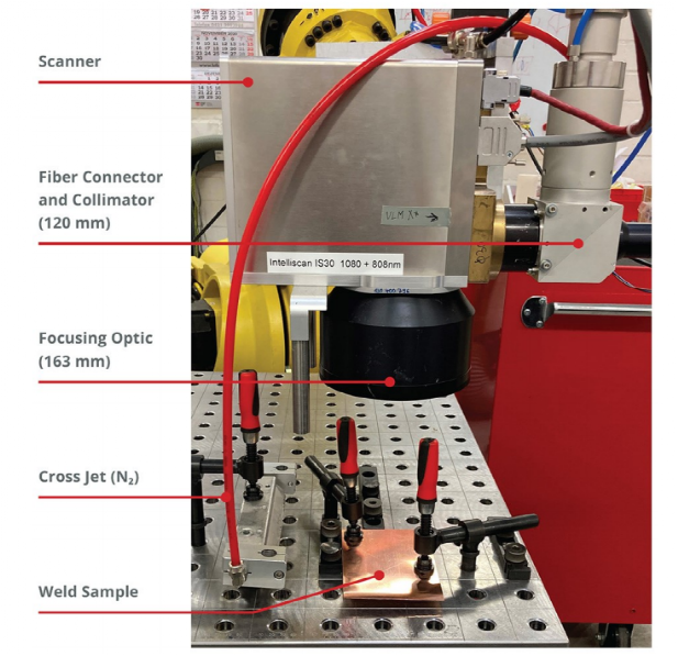 Coherent應(yīng)用工程師使用 ARM 激光進(jìn)行了一系列銅焊接測(cè)試,該激光具有直徑為 22 μm 的高亮度中心光束和內(nèi)徑/外徑為 100 μm/170 μm 的環(huán)形光束。使用放大倍率為1.4 的遠(yuǎn)端加工頭聚焦激光,并使用氮?dú)庾鳛楸Wo(hù)氣體和橫向射流。焊接的材料是純銅。所有測(cè)試的激光功率均為 4 kW,中心為 1.5 kW,環(huán)形光束為 2.5 kW。照片(圖 2)顯示了實(shí)驗(yàn)裝置。
