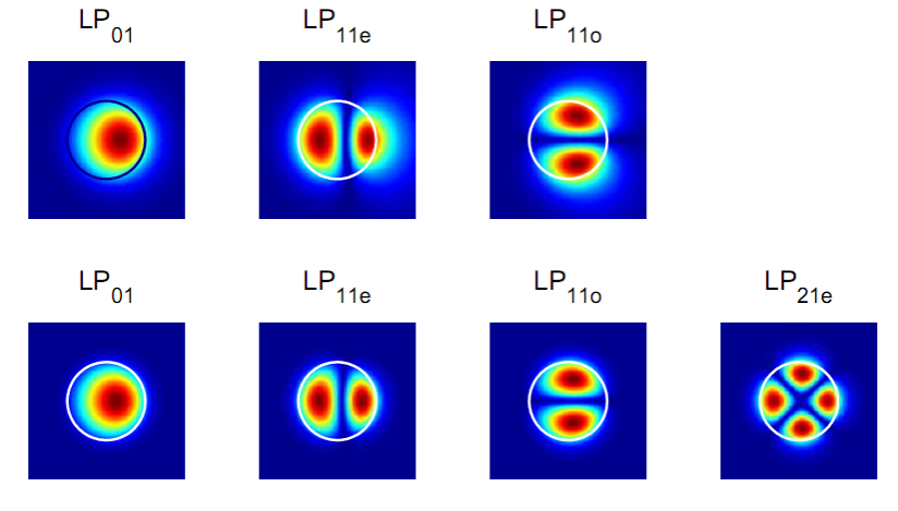 當(dāng)存在彎曲濾模等機(jī)制時(shí),基模損耗小,高階模式的彎曲損耗大,導(dǎo)致綠線的高階模式被濾除,則輸出端表現(xiàn)為時(shí)域上的基模抖動(dòng)。