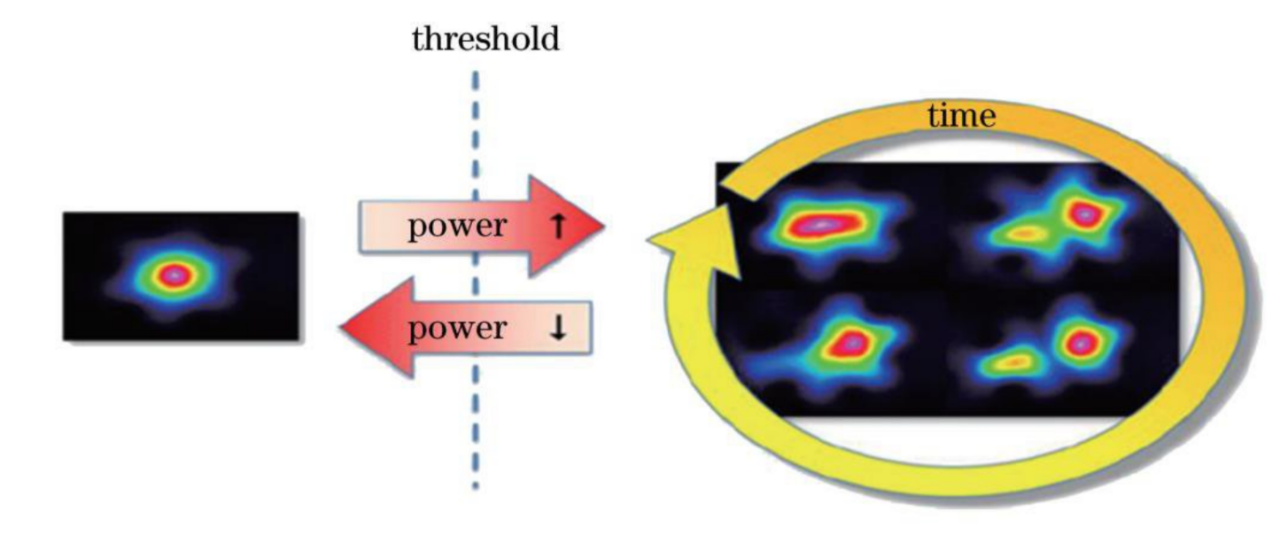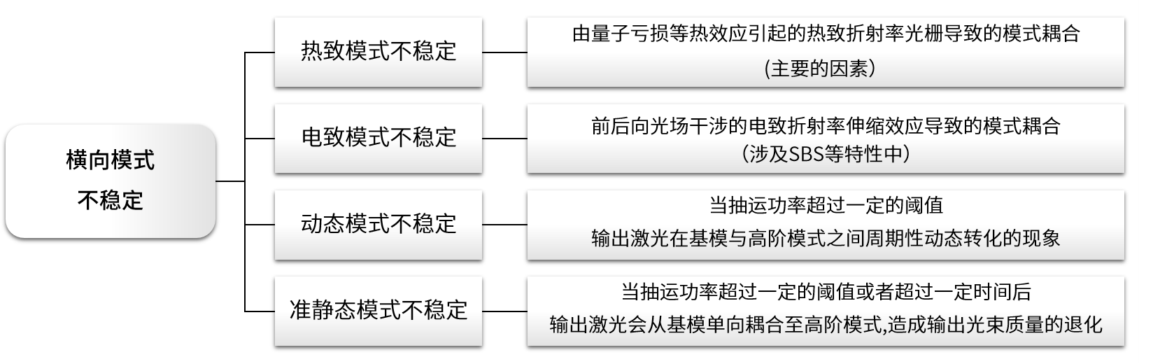 橫向模式不穩(wěn)定是指高功率光纖激光在達(dá)到某一特定閾值后,隨著輸出功率提升或超過(guò)一定時(shí)間發(fā)生的由穩(wěn)態(tài)基模輸出突然變?yōu)榉欠€(wěn)態(tài)高階模式輸出,它會(huì)導(dǎo)致光束質(zhì)量下降,限制光纖激光輸出功率的提升。嚴(yán)重情況會(huì)讓號(hào)稱 “最快的刀,最準(zhǔn)的尺,最亮的光”的激光名不副實(shí)。