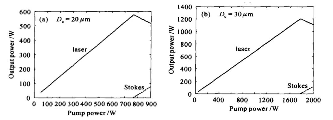 1.纖芯直徑對(duì)輸出的影響隨著抽運(yùn)光功率增大到一定值時(shí) , 光纖激光器中出現(xiàn)受激拉曼散射, 輸出激光功率開(kāi)始減小 。在正向抽運(yùn)下 , 當(dāng)光纖長(zhǎng)度一定 ( L =15 m) 時(shí),纖芯直徑增加,SRS的功率閾值會(huì)大幅提升。為了減小受激拉曼散射的影響 , 可以采用大直徑纖芯的光纖。