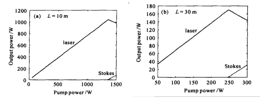 2.光纖長(zhǎng)度對(duì)輸出的影響正向抽運(yùn)下 , 當(dāng)纖芯直徑一定(20μm),隨著光纖長(zhǎng)度的增加,SRS的閾值會(huì)急劇降低。通過(guò)減小光纖長(zhǎng)度, 可以得到較高的輸出功率。